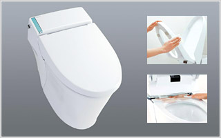 タンクレスのコンパクトボディで、スペースのゆとりが違います。うれしい機能を凝縮した、きれいトイレ「サティス」です。