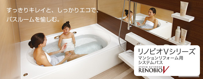 マンションリフォーム用システムバスルーム リノビオは、「キレイ」「エコ」「取付性」の三位一体でさまざまなリフォームにフィットする快適バスルーム。